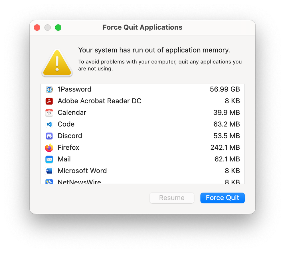 I restarted my system, restoring windows. A few seconds after signing in, I believe I unlocked 1Password. A few moments later, my system warned that 1Password had very high memory usage. I force-quit and relaunched 1Password, and the issue did not reoccur.