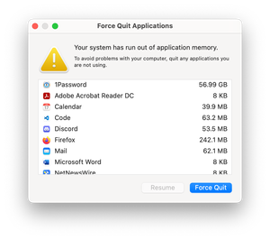 I restarted my system, restoring windows. A few seconds after signing in, I believe I unlocked 1Password. A few moments later, my system warned that 1Password had very high memory usage. I force-quit...