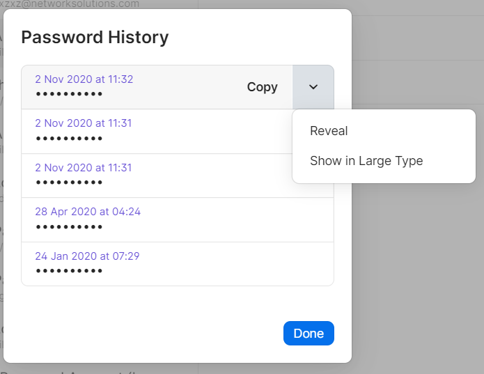 Selecting "View password history" displays concealed passwords, pressing option does not change that.