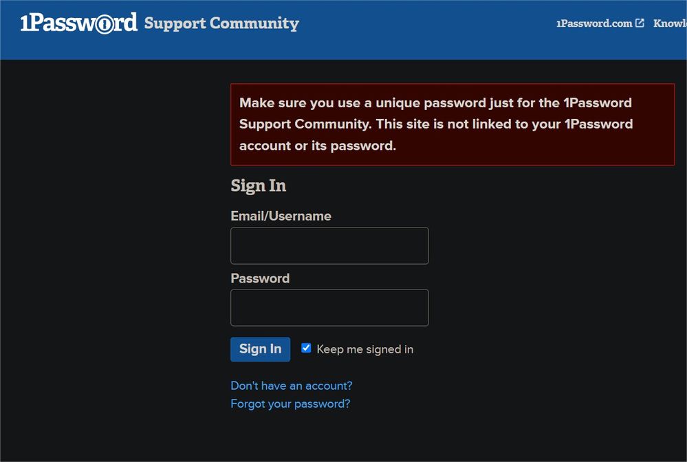 With regard to the 1Password Support Community Website, I understand your point about the "Keep me signed in" option defaulting to being checked and as an option, suggest unchecking that box if you prefer to do so.