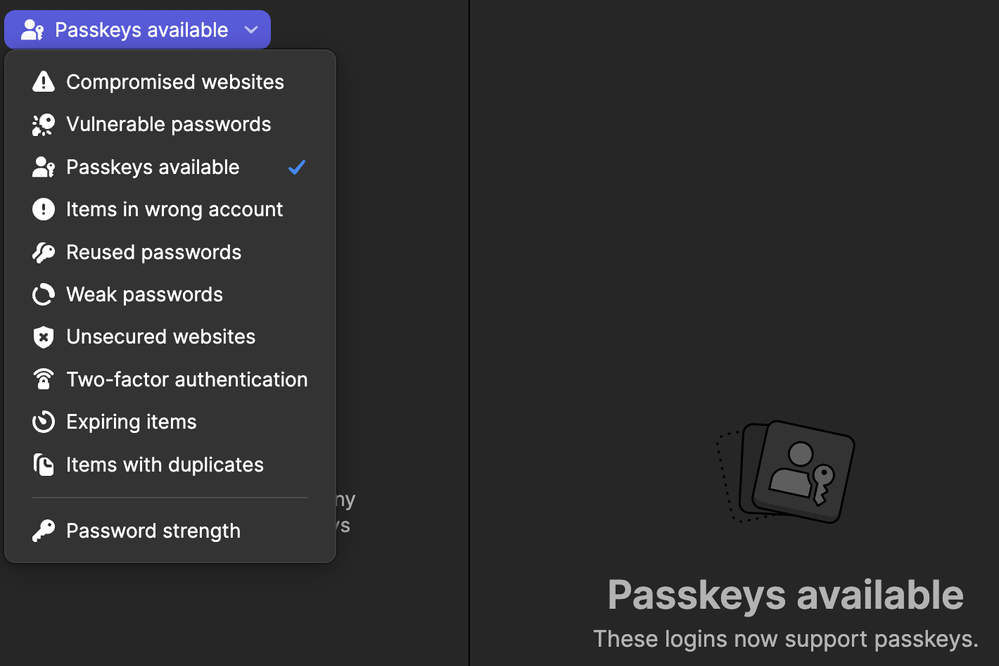 Came here to +1 this as I just came across this issue when I noticed my Mac app doesn't show 'passkeys available for these sites' in Watchtower anymore, despite having the option enabled to check for passkeys in settings. I searched for passkeys in the main search and strangely it did find 2 sites that I have it set up for, but not the rest of them.