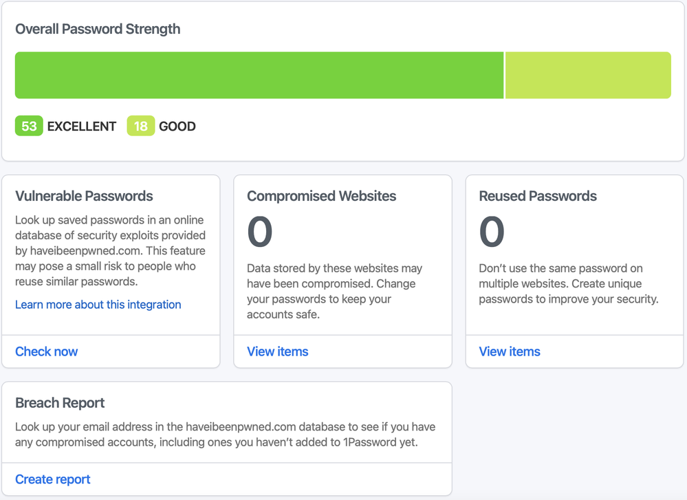Hi Jack, thanks for your reply. I have attached the Watchtower report from 1Password.com. If I understand your response, then what I see in 1Password on my Mac is displayed correctly. I do notice though there is a discrepancy between the details shown in the bars between the two. Is there a difference in how the two environments summarize?