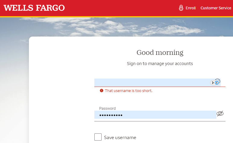 1P_Dave - Wells Fargo again, after the June 2024 update. My autofill (on Chrome) is not working for the username, and I get the odd "too short" message below. The URL I use to log in from is: https://connect.secure.wellsfargo.com/auth/login/present?origin=cob&LOB=CONS