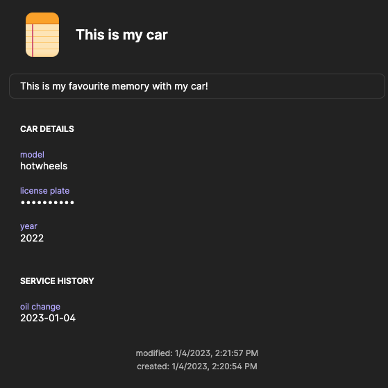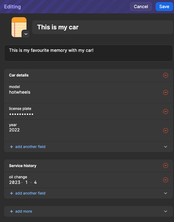 Note the you can use sections to group different fields together and that certain fields have their own properties. For example, I used a password field for the license plate, which obscures it as sensitive information.