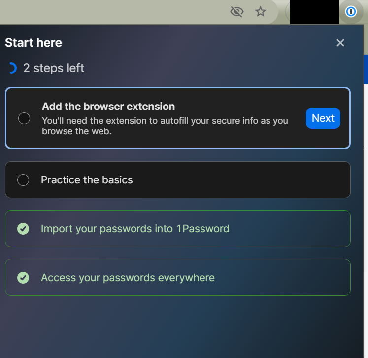 When I just logged in, there was a window in my 1Password that indicated I had 3 steps left. Funny but I've used 1Password for 10 years. So, what's with the little window? It's asking me to do something to use the Browser Extension, which I already use. It's asking me to import passwords. So, do I need to do something new or delete this somehow? Advise please.