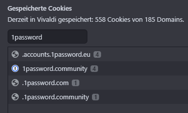 In Vivaldi-Browser actually I have 4 cookies matching 1Password. Maybe this helps?