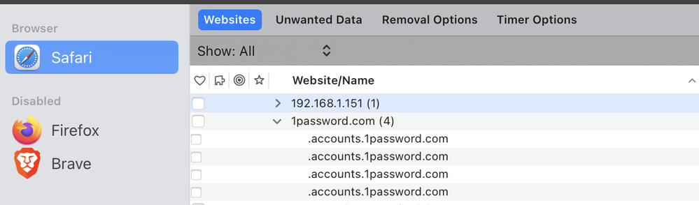 Safari simplifies things and includes all the cookies under 1password.com, and 1passwordusercontent.com.