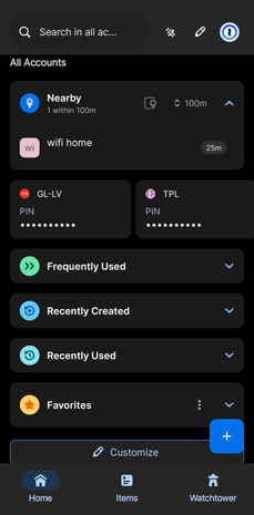 With the launch of our updated 1Password mobile apps back in 2022 we added a customizable home screen (and item screen too). Since then we’ve made a number of enhancements, and added some great new features like nearby items. Here’s how I have mine setup currently: