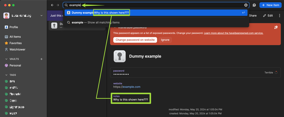 Why are contents of the "notes" field shown in the search box??