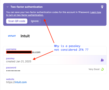 I have a username/password for https://intuit.com and have generated a PassKey. But in my account record, I'm still seeing the suggestion for 2FA. Wouldn't the passkey be considered enough to stop th...