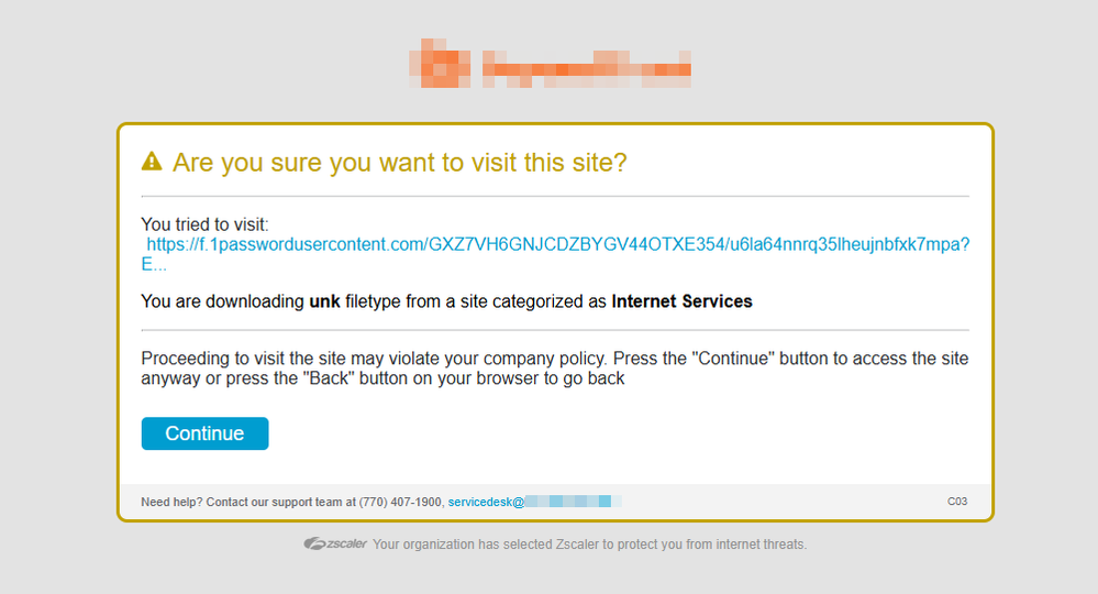 As for my issues, it's Zscaler. Your domain is probably mislabeled as Internet Services, so that's one reason it's blocked. Also, Zscaler doesn't like that the file trying to download is an "unk" file extension so it blocks because it would be an "undetectable file" due to the weird file extension. Zscaler is widely used.