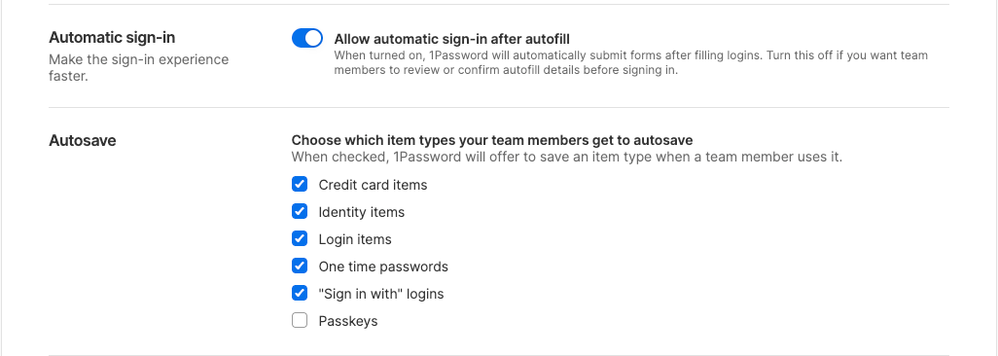 - Autosave: Choose which item types 1Password can offer to save (credit cards, identities, logins, OTPs, passkeys, social logins, etc.).