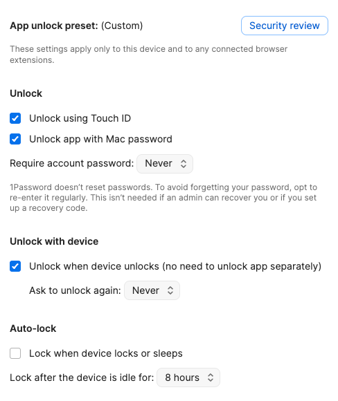 If you’re already running the latest version of 1Password (currently 8.11.18) you’re on the right version for these new unlock presets. Nothing extra needs to be installed. This rollout is happening through a feature flag, which is why some people are seeing the new options immediately and others aren’t.