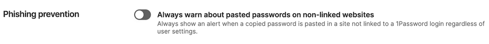 This feature is rolling out to all Individual, Family, and Business customers over the next few weeks. For Individual and Family users, built-in phishing protection will be enabled by default once it rolls out to you. If you're a 1Password Admin, you can enable it for your team in Authentication Policies in the admin console as shown below.