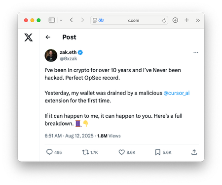 A user on X recently lost their entire crypto wallet after installing a malicious extension in Cursor.ai. The extension accessed their .env file, extracted private keys, and sent them to an attacker’...
