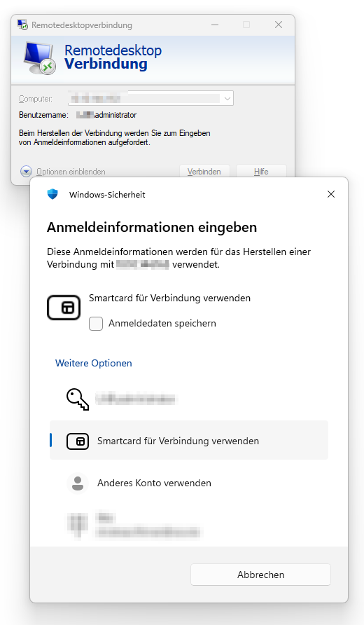 In some environments, the solution might be for 1Password to provide a virtual smartcard, while in others it might be a virtual Fido2 device. I think there are security design limitations that will prevent a "vFido2" device I guess. In this case, how about using a virtual smartcard so that the option "Use Smartcard for this connection" ("Smartcard für Verbindung verwenden") can be selected?