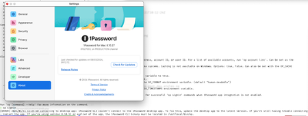 [ERROR] 2024/03/11 11:25:40 connecting to desktop app: 1Password CLI couldn't connect to the 1Password desktop app. To fix this, update the desktop app to the latest version. If you're still having t...
