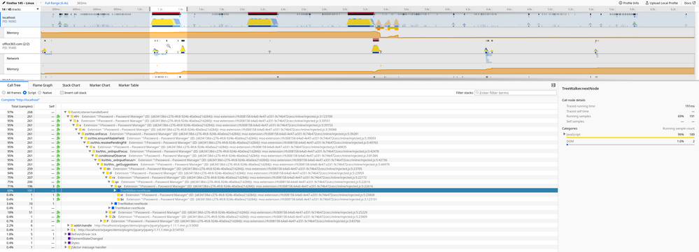 I made a performance recording in firefox. I selected 3 inputs and after the 3rd on selected the same 3 in the same order with no slowdown. I've tried adding data-1p-ignore and autocomplete="off" but it didn't solve anything.
