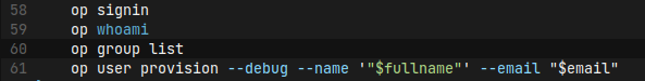 Yes, I tired that as well as checking the group status, everything looks good (same user/correct account) both from script output and from directly running it. Real mystery to me as to why I still get "[ERROR] 2023/03/14 09:35:24 You are not in the Provision Managers group." (Also tested 'op group ls' in script and directly, output macthed up fine) - Jack_P_1P