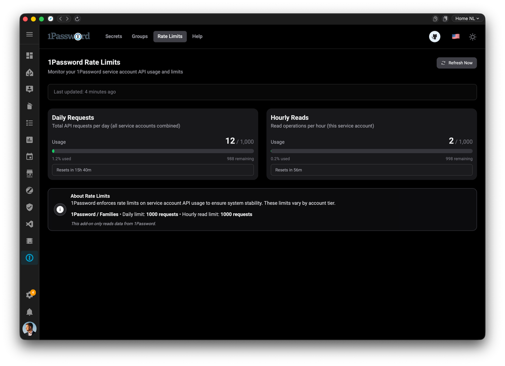 - Rate Limit Monitoring: Track your 1Password API usage to stay within daily limits