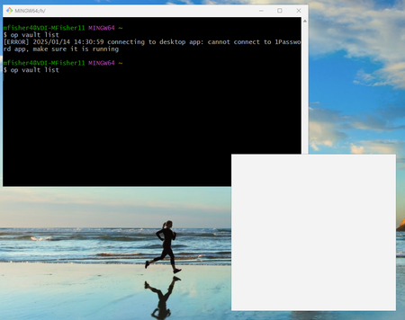 I am trying to use 1Password on Windows 11 via Git Bash. This used to work for me on the Win10 VDI that my Win11 VDI was cloned from. I get a blank gray popup window when I try to do privileg...