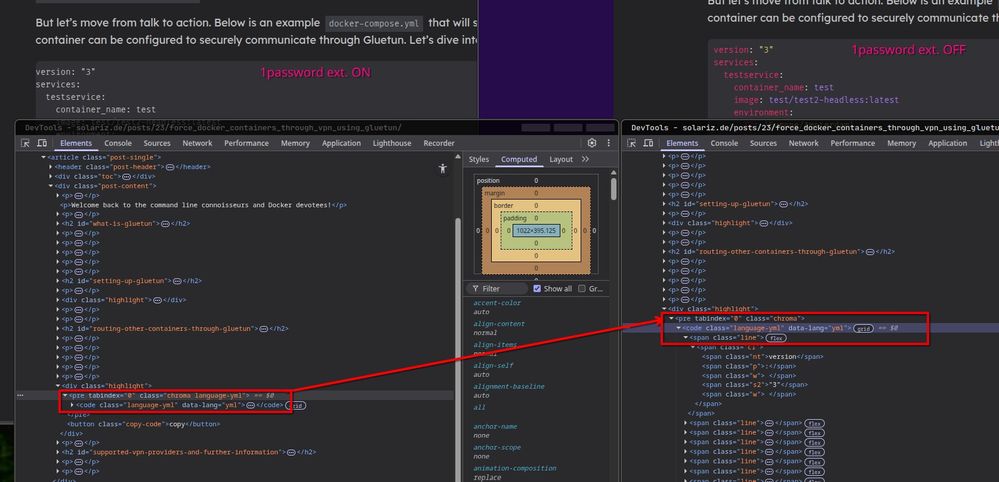 When Enable the 1pass Extension (left screenshot) it modify the code and cause the highlighter not working as before. Extension disabled, right side, works again.- takuyaharaOccasional Contributor