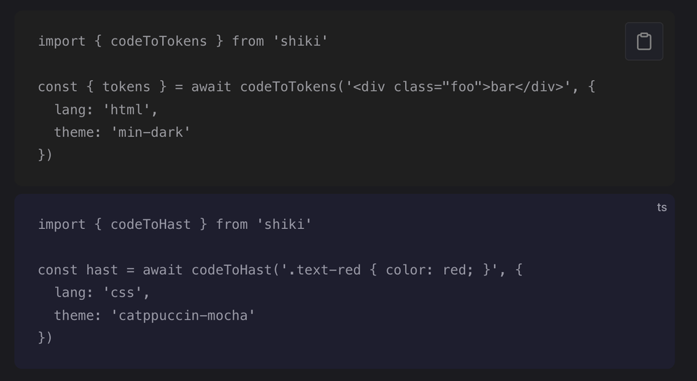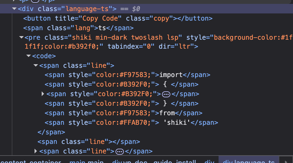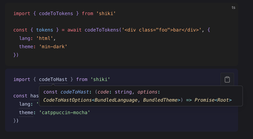 I was looking https://shiki.style/guide/install , an NPM package which provides syntax highlighting and showing detail hovering on keywords. It is expected to be shown and work like this