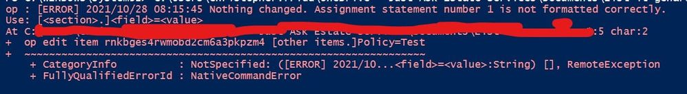 Policyfield name is unique for the item, then you can simply omit the section, such as:op edit item [uuid number] policy=TestNote that spaces can be omitted in section and field names when specifying an assignment, and also that it is not case sensitive for your convenience.