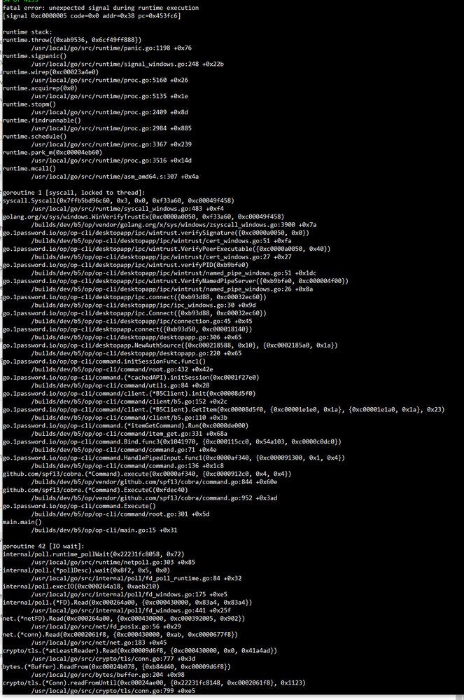 Just wanted to drop by to let you know that we have just released v2.11.0 of 1Password CLI, which should address this issue. See https://developer.1password.com/docs/cli/reference/update/ for instructions on how to update.