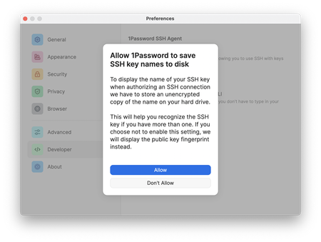 3 years agoYour 'Allow' vs. 'Don't Allow' choice in this dialog does not influence whether the SSH agent is enabled or not. It only changes the "Display key names when authorizing connections". If you opt out of that setting, the agent will still work fine, but the prompts will display the SSH key fingerprints instead of key names.