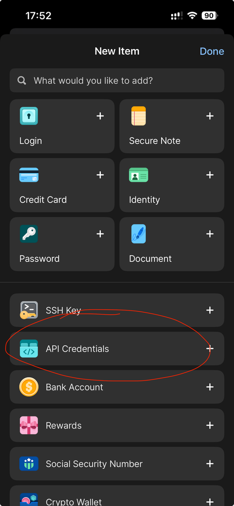I would like to see a new item type: API Key for securely storing machine-to-machine credentials used in development and automation. It would include fields for the key, environment, service name, expiration, rotation schedule, and scope. This would help developers separate API credentials from personal passwords, reduce misuse, and support compliance best practices. This important because API keys are generally created and shared only once. Being able to store these safely in 1Password would be a big help. By having a new Item type, these can be more easily browsed as a group.