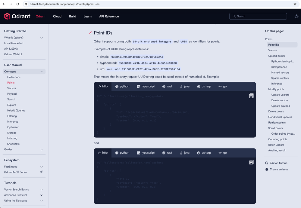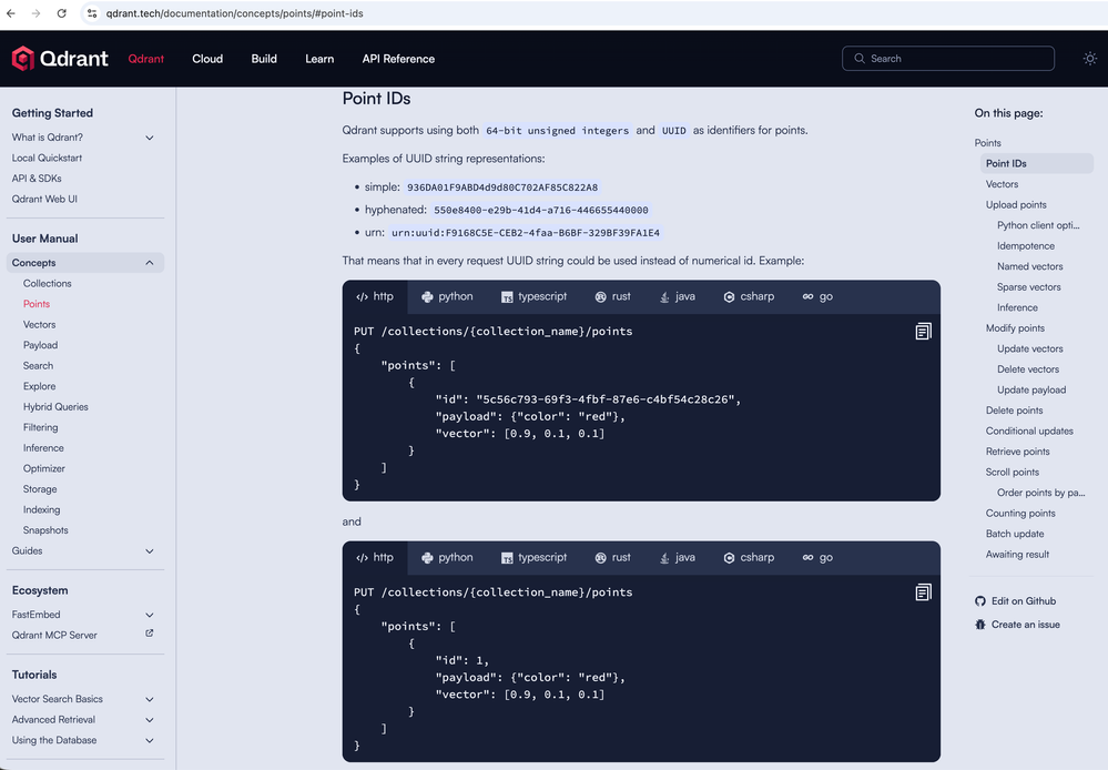 - Go to an example documentation page with code snippets: https://qdrant.tech/documentation/concepts/points/