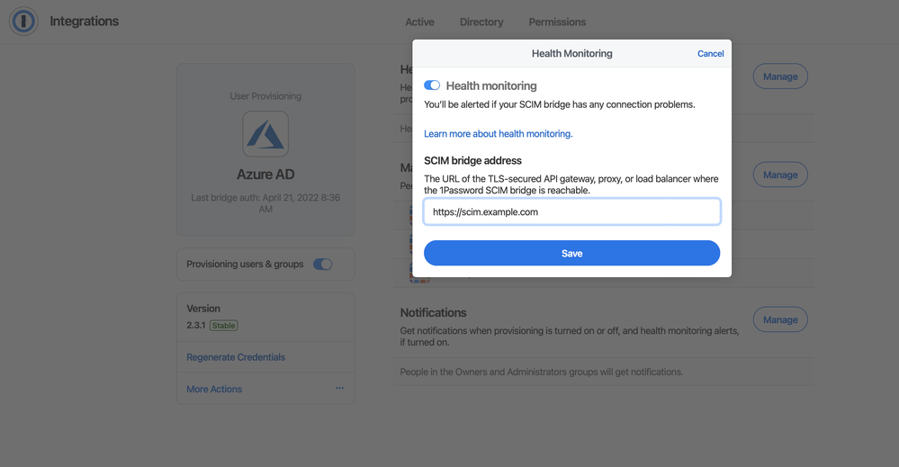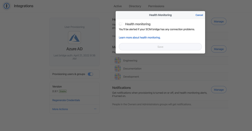 In the future, to enable Health Monitoring after deployment, you can go into the integration and under Health Monitoring, click Manage, toggle on Health Monitoring, enter your SCIM bridge address, and then press Save.