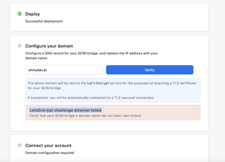 The rate-limit errors are due to Let's Encrypt rate limiting you due to the several requests sent to try to validate the domain used for your SCIM bridge. Because of this rate limit enforced on the subdomain, there are two possible ways to fix it: