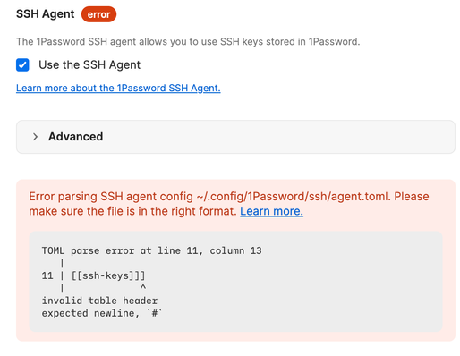 Thanks for reporting! That sounds like a bug. Could you check if you see an error reported in the SSH agent settings panel? If it's a TOML file parsing error, you should see an error message displayed there.