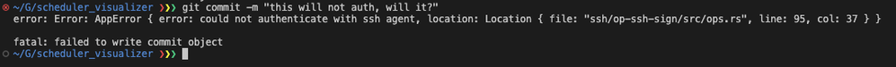 error: Error: AppError { error: could not authenticate with ssh agent, location: Location { file: "ssh/op-ssh-sign/src/ops.rs", line: 95, col: 37 } }