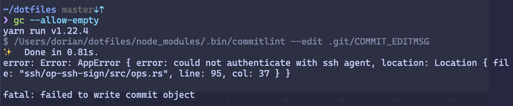 error: Error: AppError { error: could not authenticate with ssh agent, location: Location { file: "ssh/op-ssh-sign/src/ops.rs", line: 95, col: 37 } }fatal: failed to write commit object