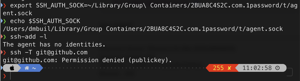 $ export SSH_AUTH_SOCK=~/Library/Group\ Containers/2BUA8C4S2C.com.1password/t/agent.sock