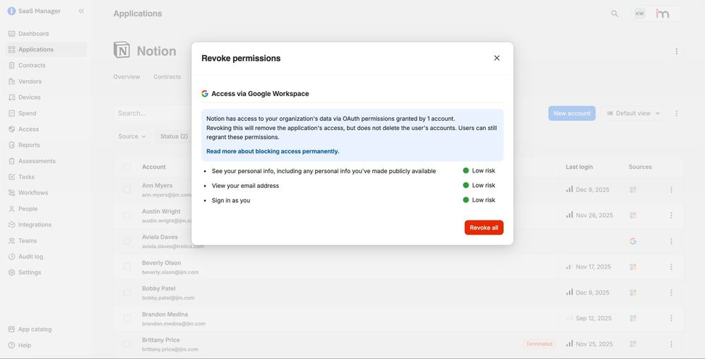 - Revoke risky OAuth tokens – tokens that let an app access a user’s data. Removing them helps limit unnecessary data sharing and potential exposure.