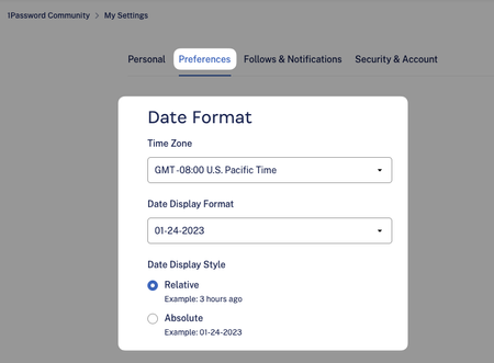 You can control a number of different display preferences, including your time zone, preferred display language, and date format, To set your viewing preferences: Go to My Settings > Preferences. Select your preferred Time Zone, Language, and Date Display Style.43Views0likes0Comments