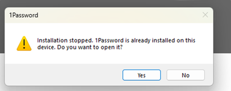 So I was suddenly being upgraded to this new experience today, however, it does not seems to be appearing on the https://releases.1password.com/b5x/beta/#changelog. I guess making the login selection up above resolves one very specific issue - sometimes it can annoying to have 1P prompting under a text box, especially when filling in forms. But I don't think this new design is the answer. Main issue - Long mouse travel - Instead of just flicking my mouse to choose my account, I now have to move my mouse all the way top to click it, which is never a trade off I would take to fix the "filling in the form" issue. Secondly, it was not visually better to have a much larger pop up blocking my web view whenever I am logging in.Solved142Views2likes5Comments"Installation stopped. 1Password is already installed on this device" Notification