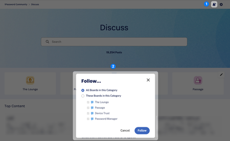 Keeping up with the conversations and topics that matter to you is easy in the 1Password Community. You can subscribe to categories, threads, or discussions to make sure you never miss a thing. Following Categories If you’re interested in a whole topic area, subscribing to a category ensures you’ll stay updated. Navigate to the category you want to follow (e.g., Our Apps, Release Notes, Developers). Click the Bell icon at the top of the category page. Select and confirm the board you’d like to follow.63Views1like0CommentsPosting and replying in the community