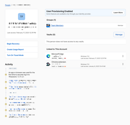 Hey all, I ran into an issue when integrating 1Password with our IdP Okta, a good amount of our users use 1Password as a means to store their MFA codes, including Okta. This meant that when the users tried to login to 1Password, they found that they could no longer access the MFA code for Okta to login to 1Password. And that left them stuck in a loop, need Okta MFA code to login to 1Password, can't login to 1Password sine they need the MFA code. Is there a solution for this other than asking users to use another MFA method for Okta? We don't provide company mobile devices, and our company is fully remote meaning some labour laws restrict me asking our users to install another MFA app (like Okta verify) on their personal devices.65Views1like1CommentUser account still active in 1Password even though disabled/deleted in Okta