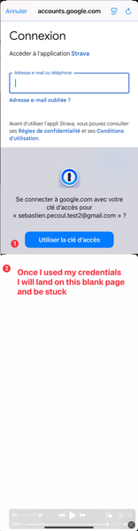 Once 1Password is unlocked, passkeys can be used without additional biometric authentication. If someone accesses my unlocked laptop before the auto-lock timer triggers, and given that passkeys replace both passwords and 2FA, they would have full access to all my accounts. I know the auto-lock timer can be set to 1 minute, but given how important passkeys is, per-use authentication would greatly enhance security. And biometric unlock makes accessing 1Password basically zero friction for the user, so it would be fine having to do it each time I want to unlock 1Password. Would it be possible to have an auto-lock immediately after each use? Environment: 1Password for Mac 8.11.8 1Password Browser Extension for Chrome 8.11.8.4061Views1like4CommentsBlank screen when using PassKeys connexion on IOS for Google