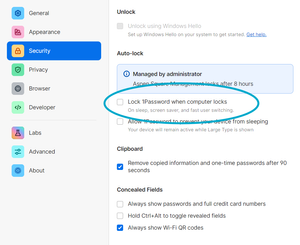 We originally packaged the 1PasswordSetup-8.4.1.2.exe installer as an Win32App and deployed via Intune. Some of the settings used were, Install command 1PasswordSetup-8.4.1.2.exe --silent Uninstall command "%LocalAppData%\1Password\app\8\1Password.exe" --uninstall With detection set to be File %LocalAppData%\1Password\app\8\ 1Password.exe File or Folder Exists With the the deprecation, we've been attempting to uninstall and have set Assignments to a test group for uninstall. However, the uninstall seems to be failing with "The system cannot find the file specified. (0x80070002)" error. We've tweaked the detection rules to no avail. Running the '"%LocalAppData%\1Password\app\8\1Password.exe" --uninstall' does work. Anyone else run into this issue or have an idea how to ensure it triggers?25Views0likes0CommentsDisabling the "lock 1password when computer locks" toggle organization wide