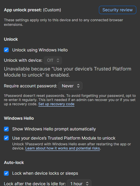 I researched removing duplicate entries in 1Password, and most articles talk about using the remove duplicate entries item in Watchtower. However, that tab doesn't exist anymore. How do I remove duplicate entries in 1Password? I am using Windows 11 Pro with the latest edition of the 1Password app.Solved57Views0likes3CommentsWindows 11 TPM unlock issues